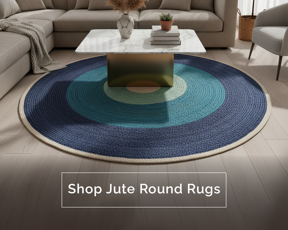 Round Jute Rug with Blue GradientHandbraided Eco-Friendly Boho Accent